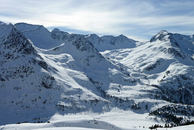 Das Gegenstück zur „Kunke“ ist der Hinterbergkofel (2.727 m). Vom Parkplatz folgen wir der gesperrten Straße (Loipe) zum Obersee und biegen kurz vor dem Grenzübergang linker Hand ins Weißenbachtal ab. Anfangs führt die Skispur durch den lichten Wald und gewinnt langsam an Höhe. Spitzkehren leiten uns nun durch freies Gelände, während im Talschluss schon die Halsscharte ins Blickfeld rückt. Sie stellt einen Übergang ins Gsieser Tal dar, bleibt aber für uns unbeachtet. Wir zweigen unterhalb der Scharte in südwestlicher Richtung zu unserem Tourenziel ab und betreten den Gipfel über dessen oft abgeblasenen Westrücken. Abfahrt entlang der Aufstiegsspur.