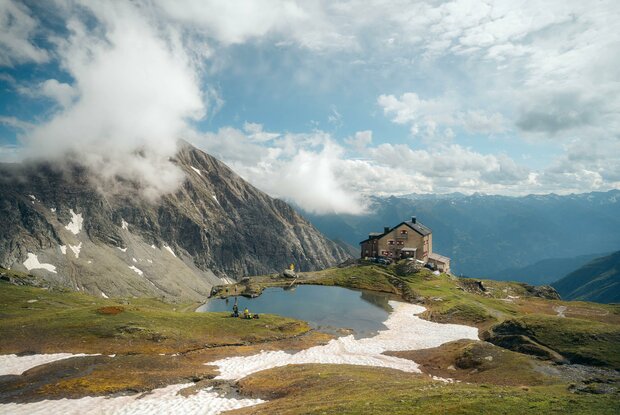 Am besten startet man diese Etappe beim Parkplatz im Weiler Glanz, dann spart man sich zwei Stunden Anmarsch. Von Matrei i.O. kann man mit dem PKW (Taxidienst auf Anfrage) in 20 Minuten dorthin gelangen. All jene, die auch diesen ersten Streckenabschnitt zu Fuß bewältigen wollen, gelangen über den wenig befahrenen Fahrweg von Matrei über Hinterburg zum Parkplatz. Vom Parkplatz in Glanz kommt man in 1 ½ bis 2 Stunden zur Äußeren Steiner Alm und in weiteren 2 bis 2 ½ Stunden zur Sudetendeutschen Hütte. Der Steig führt großteils durch einen Wald mit uralten Lärchen, vorbei an der Köfler-Almhütte (Privatalm). Im Bereich der Ranzeralm quert man zweimal den Fahrweg. Etwas oberhalb der Lackner-Almhütte beginnt ein Karrenweg, der an einer Quelle vorbeiführt, ehe er von Osten nach Westen die Edelweißwiese durchzieht. Wer nicht durch den Wald wandern möchte, kann auch vom Parkplatz Glanz entlang der Forststraße bis zum Beginn der Edelweißwiese gehen. Nach einer Felskante fällt der durch ein Geländer geschützte Steig in den lichten Lärchenwald leicht ab. Über den Steinerbach gelangt man zu den Almhütten der Äußeren Steiner Alm (1.914 Meter), von der Äußeren Steiner Alm geht es in der flachen Trogtalsohle nordöstlich weiter in Richtung Talschluss. Kleine Lärchenhaine und gewaltige Grünschieferblöcke prägen diesen romantischen Wegabschnitt. Am Ende des Talschlusses führt eine Materialseilbahn zur Sudetendeutschen Hütte, hier befand sich früher eine Förderstätte des Eisenerz-Bergbaus, deshalb wird der Talwinkel als „Schmelzhütte“ bezeichnet. Der Steig zur Sudetendeutschen Hütte führt zuerst nah am Steinerbach hinauf, dann windet er sich in Kehren über die Wiesenhänge empor, wobei man den Nussingkogel zur linken und die Bretterwandspitze zur rechten Seite hat. Schließlich wird das Gelände mit seinen von den Gletschern geformten Kuppen etwas flacher und schon befindet man sich im Nahbereich der geräumigen Sudetendeutschen Hütte (2.650 Meter) inmitten der Granatspitzgruppe.