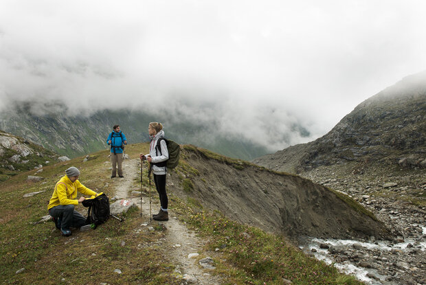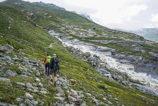 Ein Stück oberhalb der Bonn-Matreier Hütte (ca. 8-10 Minuten Gehzeit), zweigt bei Wegtafeln der Steig nach rechts ab. Man durchschreitet einen steinigen Bergtrog und erreicht schließlich die schrägen Fels-türme der Kälberscharte (2.791 Meter). Auf beiden Seiten der Scharte erleichtern Treppen und Stahlseile den Übergang ins Kleine Niltal, so bezwingt man auch den Aufstieg zur höher gelegenen Galtenscharte relativ problemlos. Nun erfolgt der steile, fordernde Abstieg hinunter zum Mailfroßnitzbach, obwohl man die 600 Höhenmeter später wieder wett machen muss. Der obere Teil des Steilstückes ist stahlseilversichert, im Mittelstück erwartet einen oft auch im Sommer ein hartnäckiges, steiles Schneefeld. Wenn man Glück hat und der Wegabschnitt schneefrei ist, verläuft der Steig durchgehend. Weiter unten wird das Gelände flacher, der Abstieg endet bei der Brücke über den Mailfroßnitzbach. Etwa 40 Meter unterhalb der Brücke befindet sich die Fortsetzung des Steiges. Hoch über dem Froßnitztal quert man nun die grünen Hänge der Hohen Achsel von Süden nach Norden und passiert dabei landschaftlich sehr abwechslungsreiche Teilstücke. Kurze Stellen sind stahlseilversichert, man kommt an zahlreichen kleinen Bächen vorbei. Auf der sogenannten Achsel befindet sich ein grasumwachsener, von einer Moräne abgedichteter Tümpel. Hier verbindet sich der Venediger Höhenweg mit dem Talweg. Es geht weiter in Richtung „Badener Hütte“, wobei man eng hintereinander gereihte Moränen und schließlich die Brücke am Froßnitzbach überschreitet. Es folgen einige Rücken und Mulden, die den Schneehühnern Schutz bieten. Schließlich gelangt man zur Seitenmoräne des Frosnitzkees´, dort hält man sich rechts und wandert weiter, bis man das Etappenziel, die Badener Hütte (2.608 Meter) am Großvenediger, erreicht.