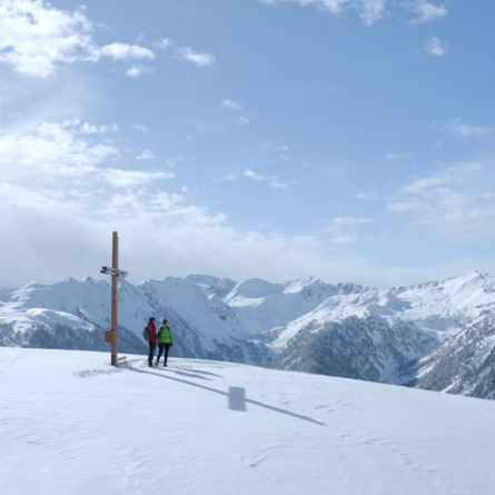 Nach der Auffahrt mit der Gondelbahn Golzentipp wanderst du durch die Unterführung und dann links hinauf auf den breiten Bergrücken, der auch Skifahrern als Piste dient. Bei der Bergstation des Glamplifts über meistens präparierte Spur oberhalb der Kutteschupfen zum Golzentipp. Herrlicher Panoramablick!