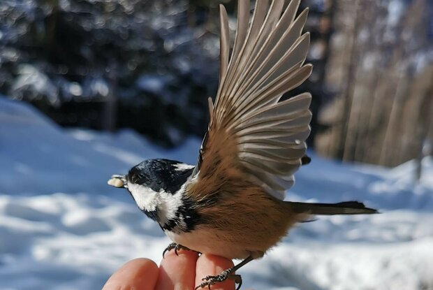 Ein Highlight bietet die Vogelfütterungsstation, wo einem die Vögel im wahrsten Sinne des Wortes aus der Hand fressen.