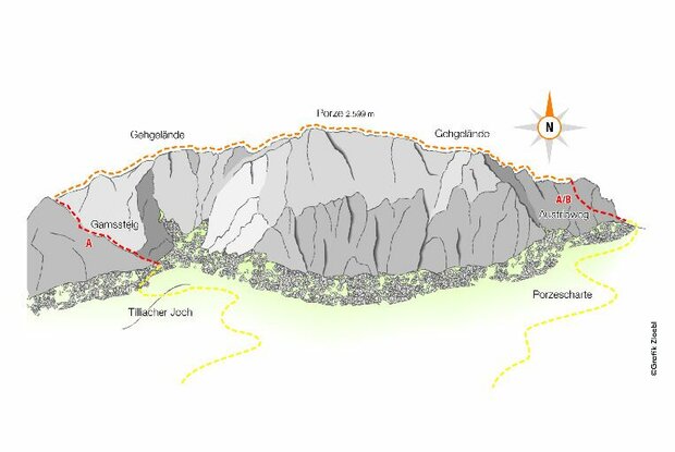 2 ½ - 3 hours. A path proceeds from Porzehütte in serpentines to the start of the Austria Weg to the Porzescharte (2363 m). Here you climb on the short and well-secured path.