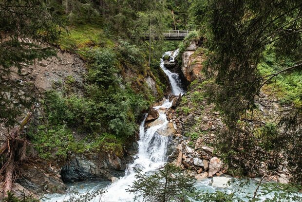 On the shady side, a little above the trail south of Prägraten, the stream Zopatnitzenbach falls through a steep ditch. Millions of water drops fill the air. The waterfall can be reached via a spur trail.