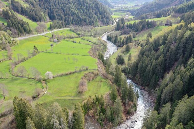 Above the Iselschlucht, the river (temporarily) calms down again. Meadows line its course on the sunny side.