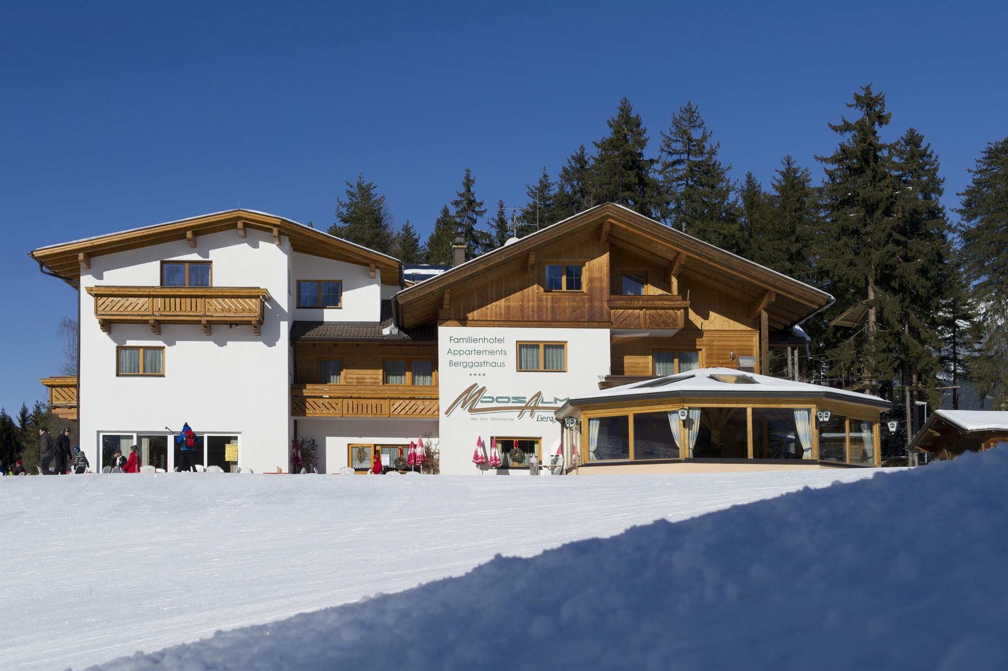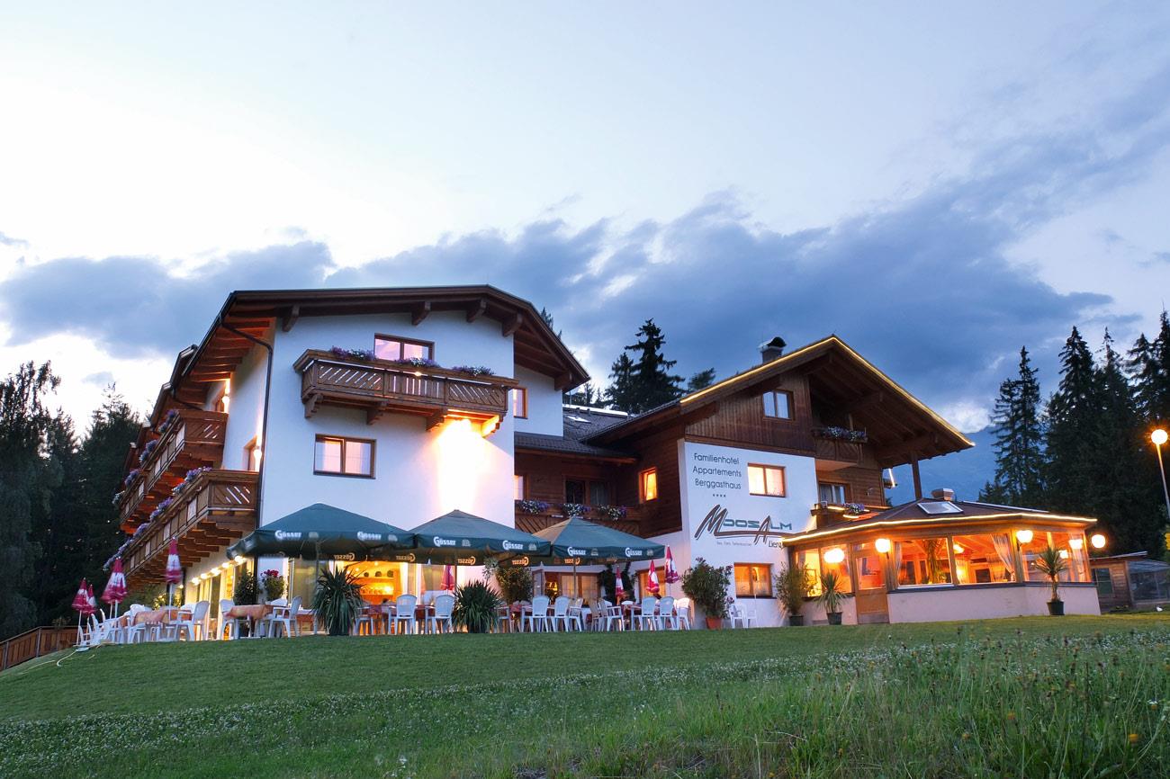 Welcome to the 4-Star-Family-hotel Moosalm. Enjoy an unforgettable holiday on the mountain at 1,006 metres above sea level amidst idyllic nature. The splendid view of the sunny town of Lienz and the Lienz Dolomites delight young and old. Our hotel is located some 2.5 km above Lienz on Schlossberg Mountain. The unique location beckons to enjoy many activities – such as hiking, skiing, observing the colourful Lienz town life or simply relax. Leave the everyday hustle and bustle behind in our family hotel with its modern facilities and enjoy our excellent cooking in good company.