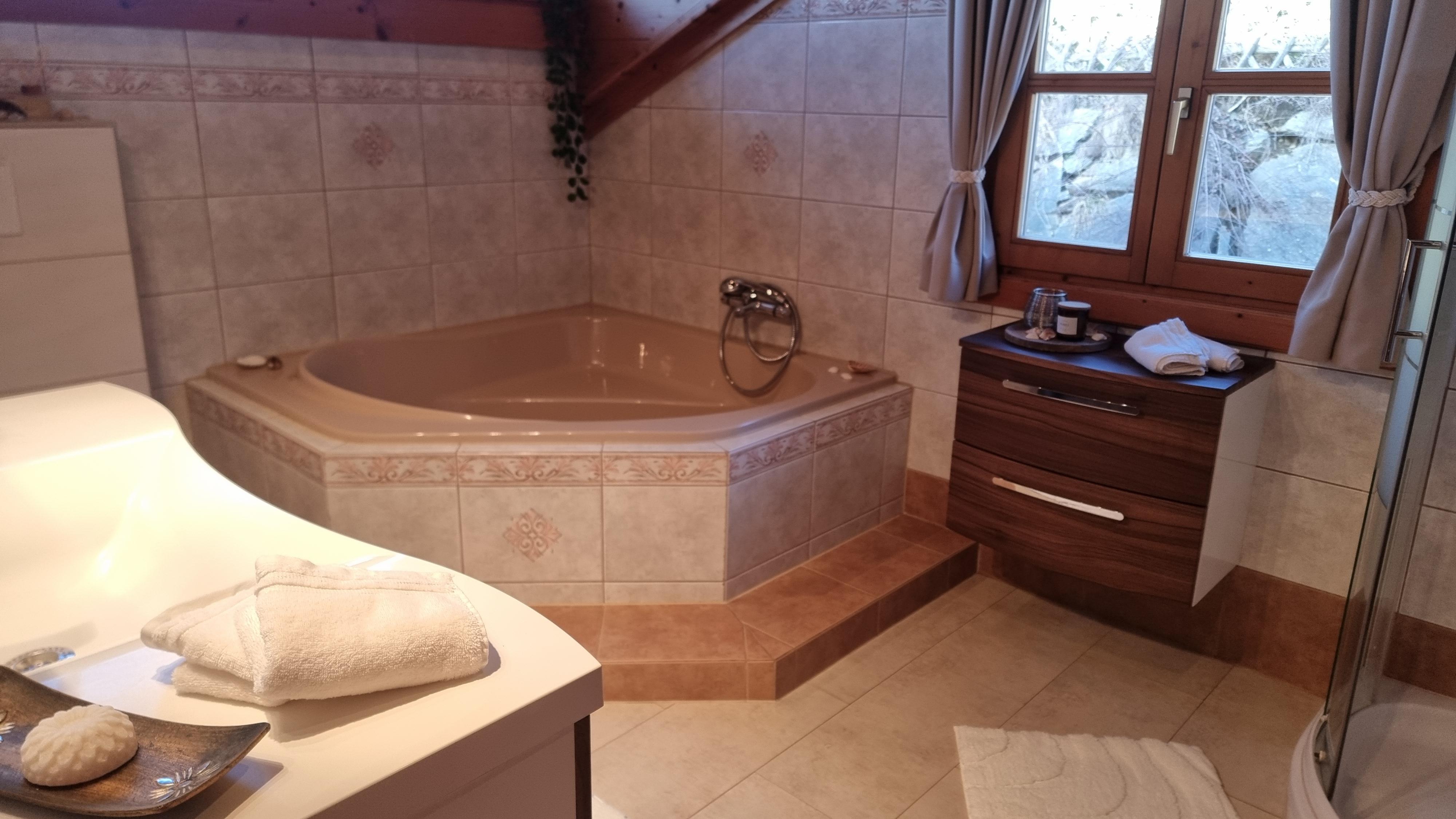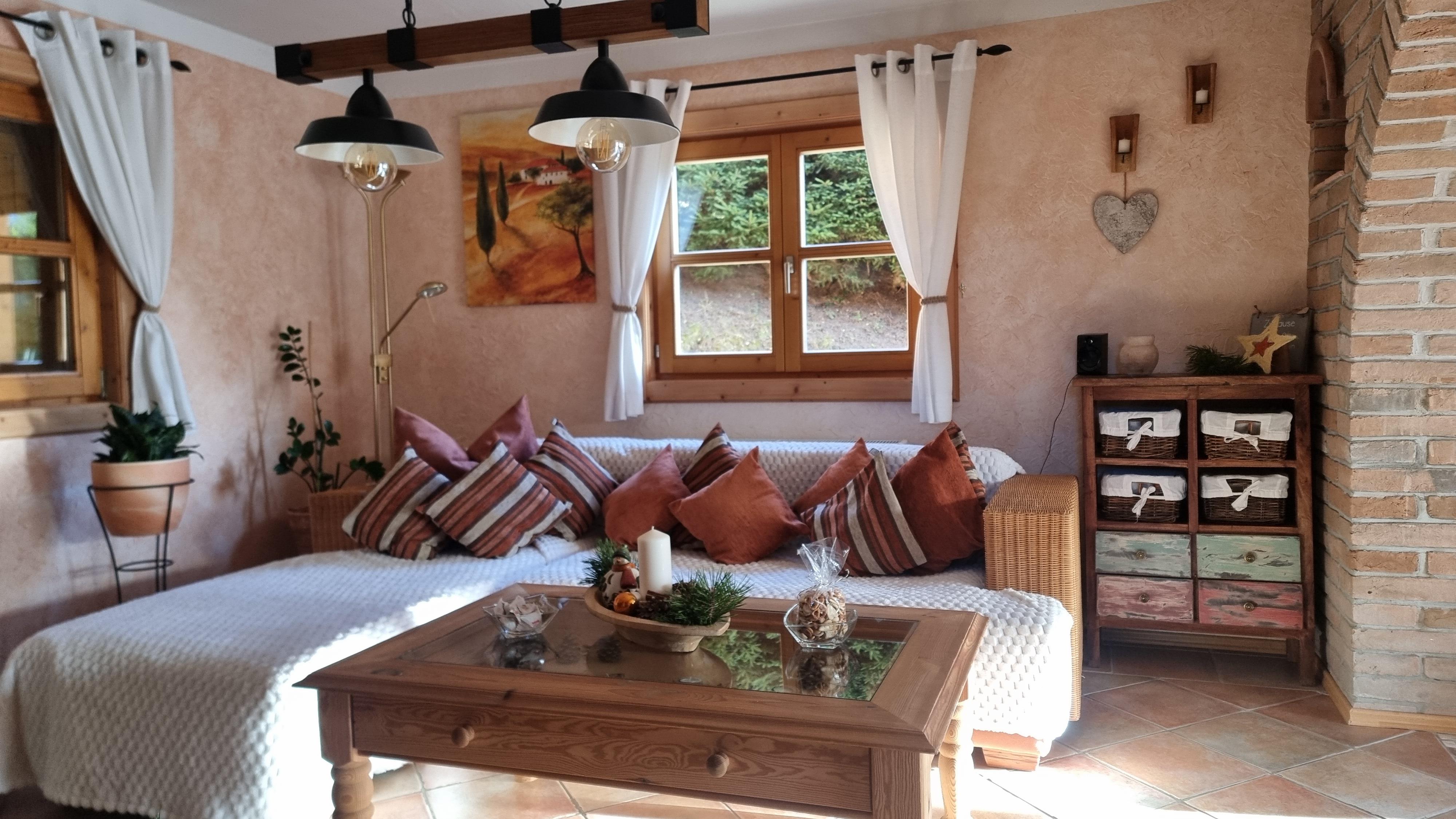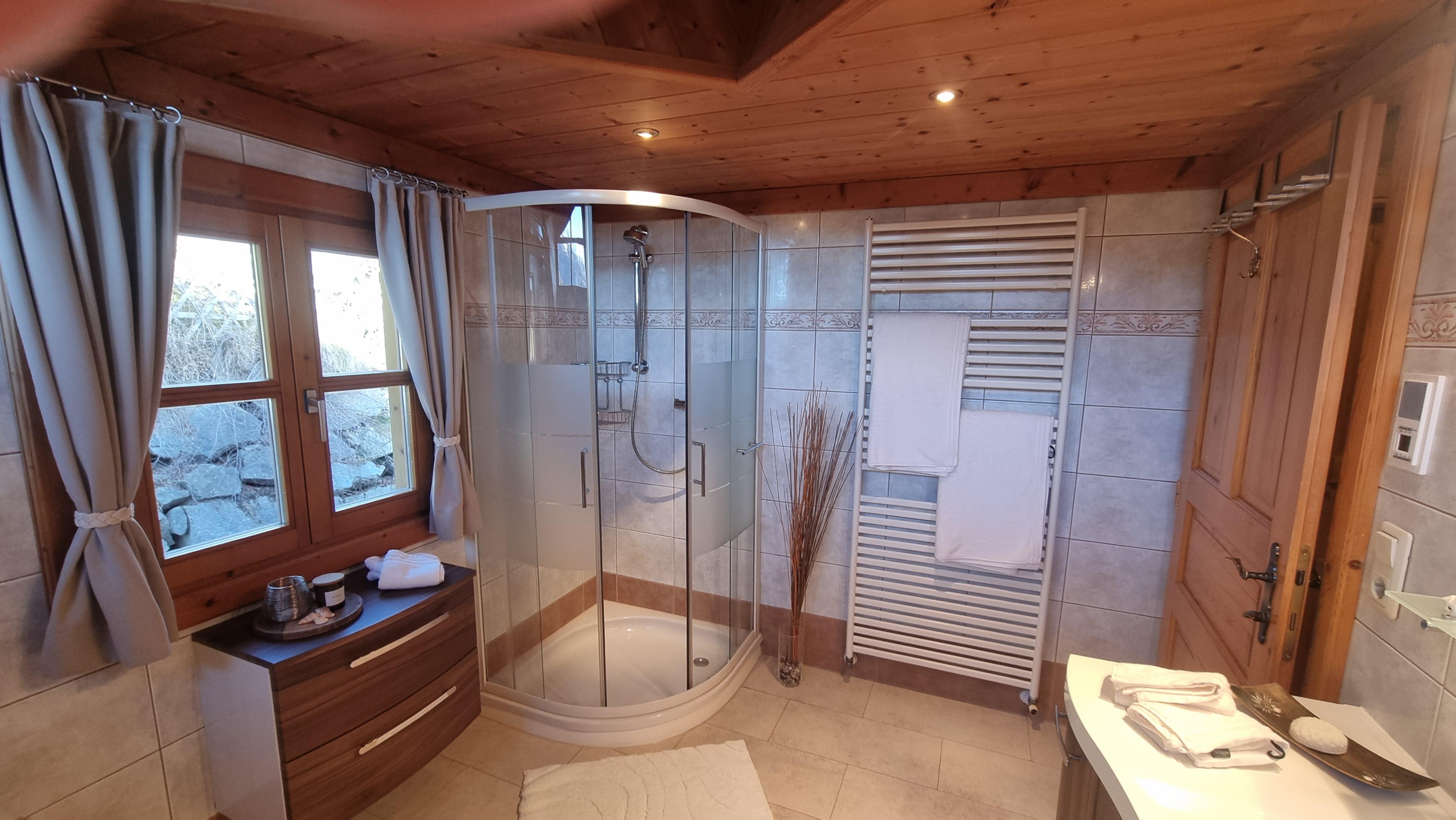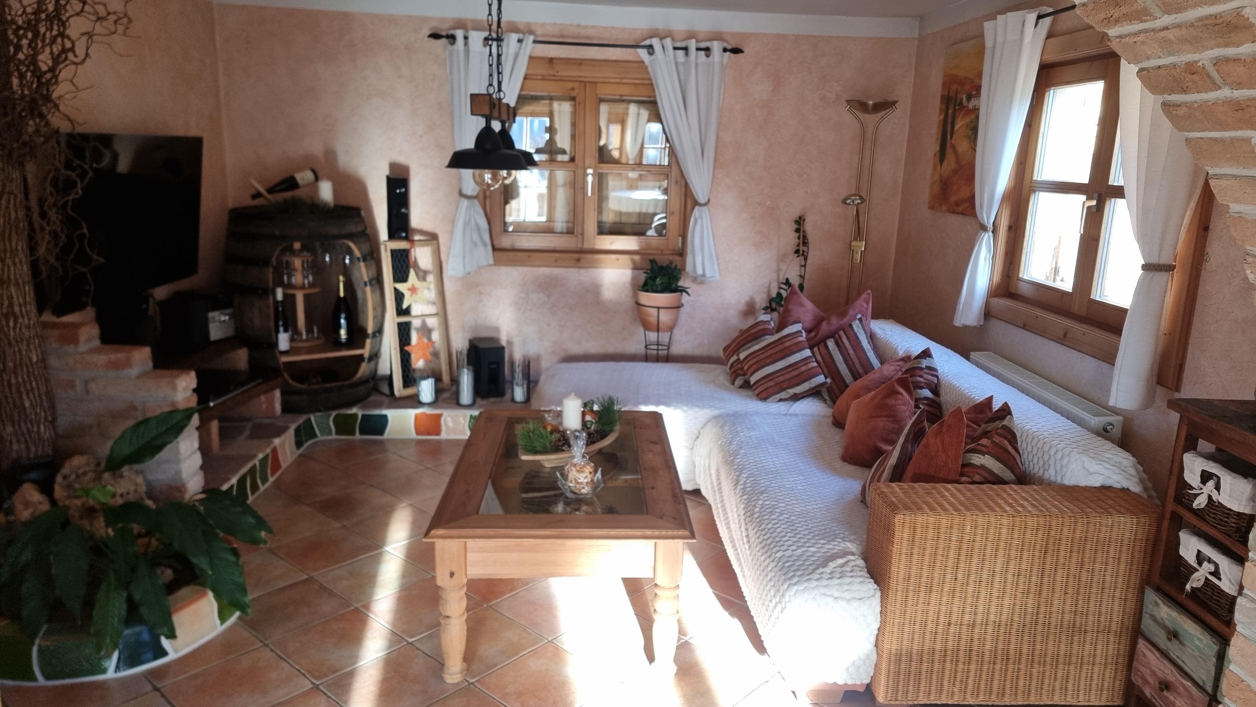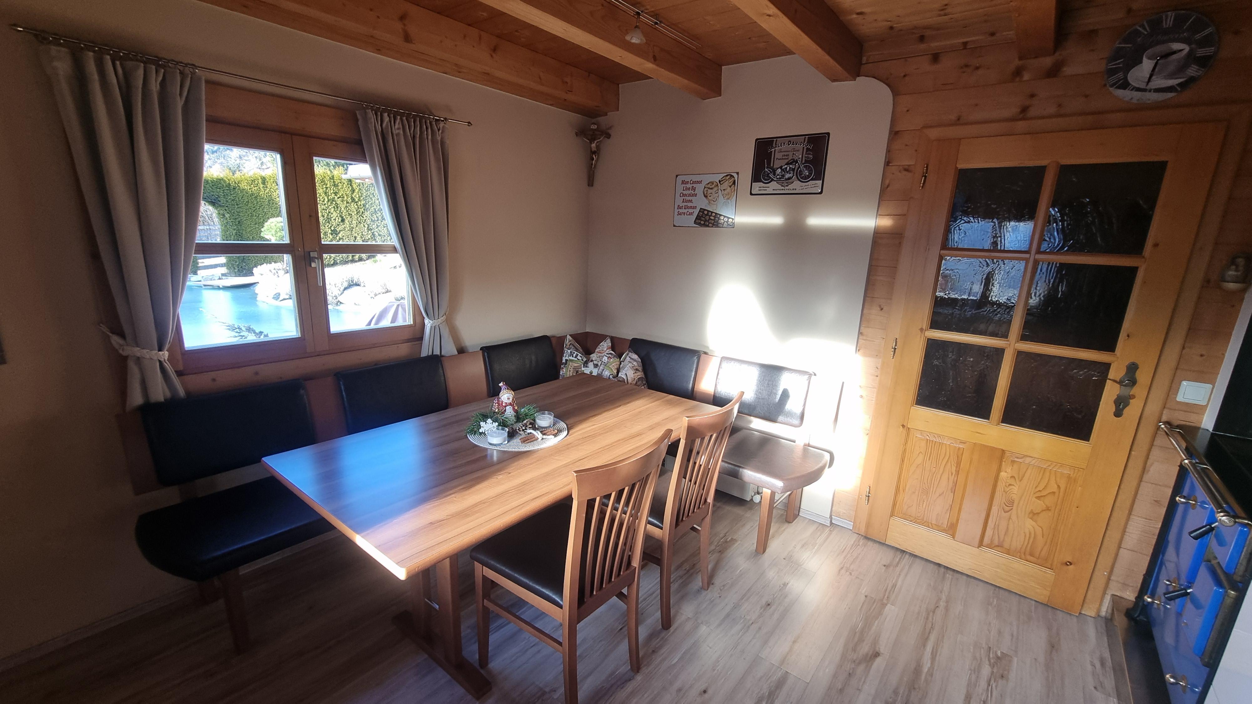 1st floor: kitchen with corner bench and dining table, living and dining room with couch/flat-screen TV/open fireplace/tiled stove, large corner bench and dining table, storage room, toilet with sink, exit to the large south-facing terrace.
