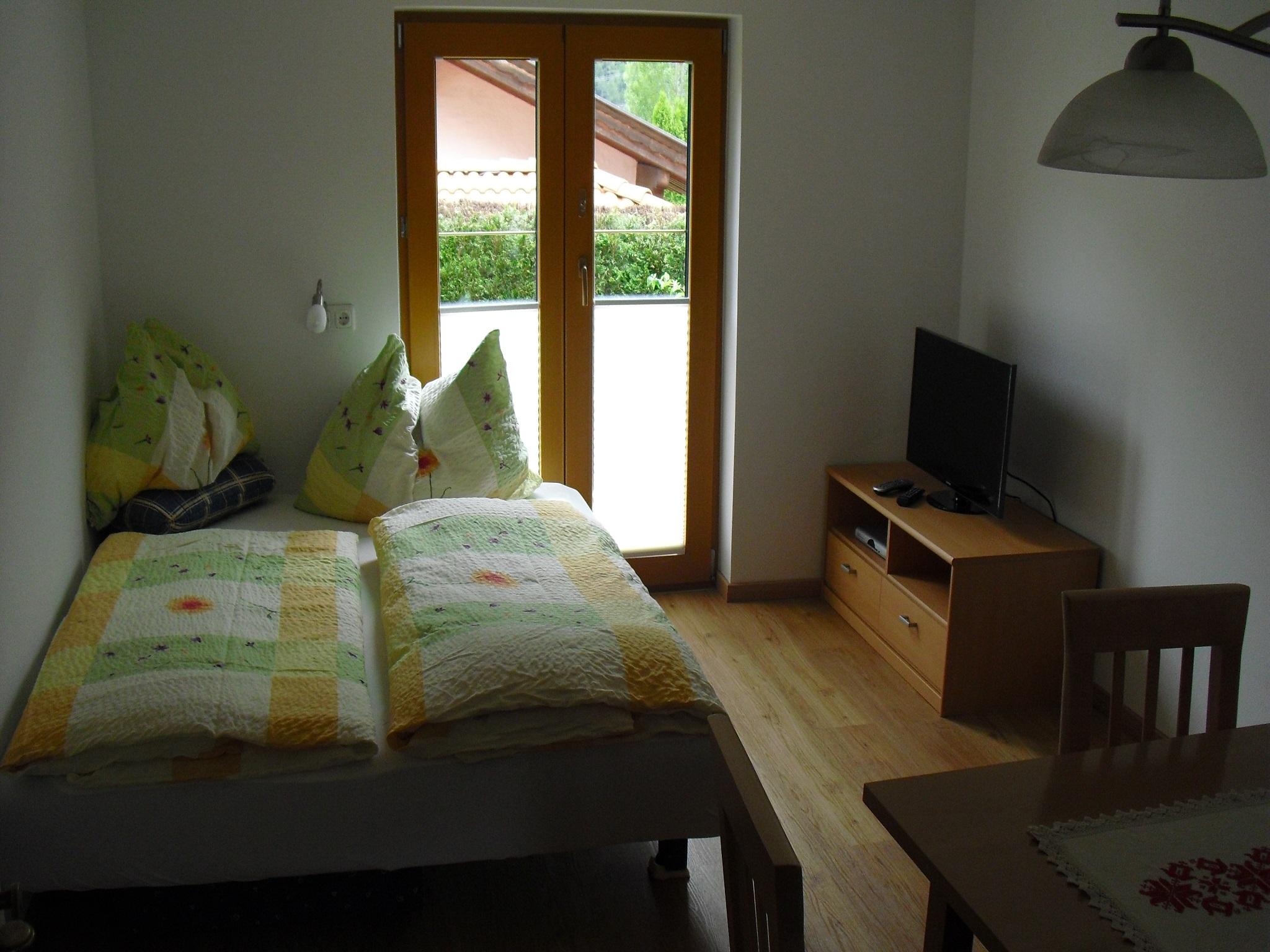 Vom Wohn/Schlafzimmer gelangen sie direkt in den Garten bzw zur überdachten westseitig gelegene Terrasse.