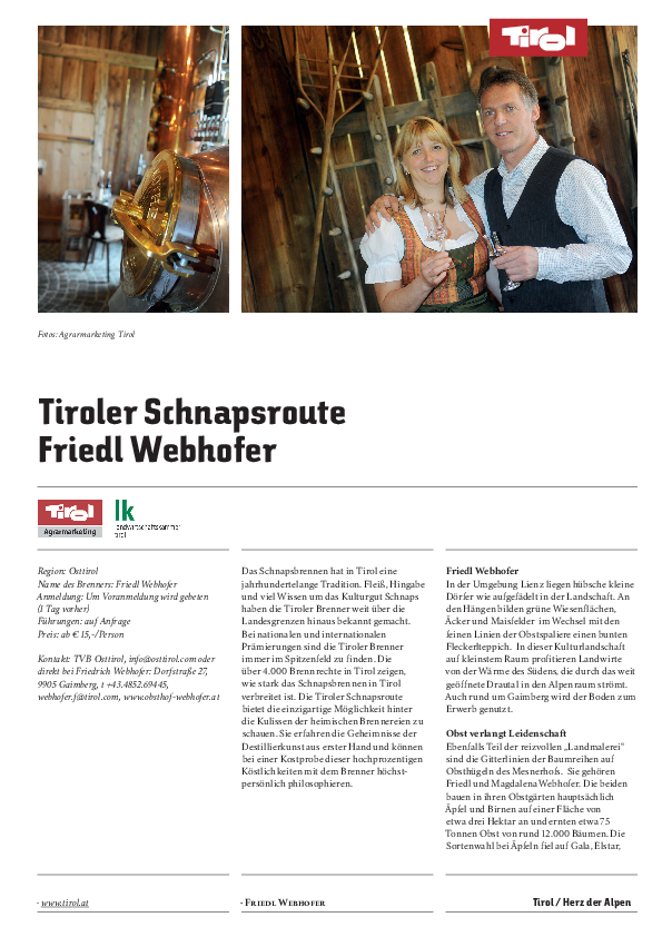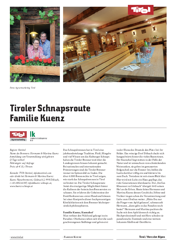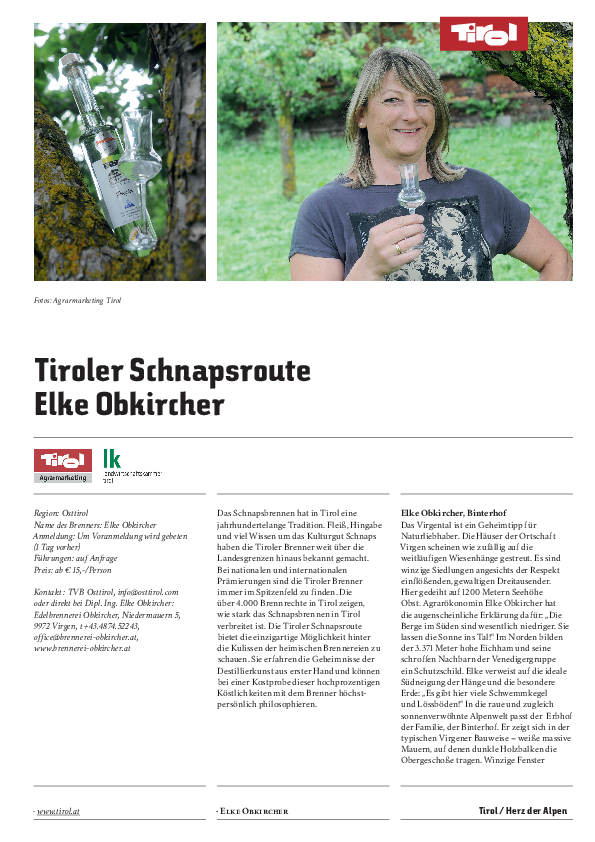 On the Osttirol Schnapps Route, the distillers will show you how to process fruit to fine spirits. In the course of such tours you will learn how the special clarity, fruitiness and purity of the local brandies is achieved. Against payment of small fee, you will be able to taste the high quality of the brandies.