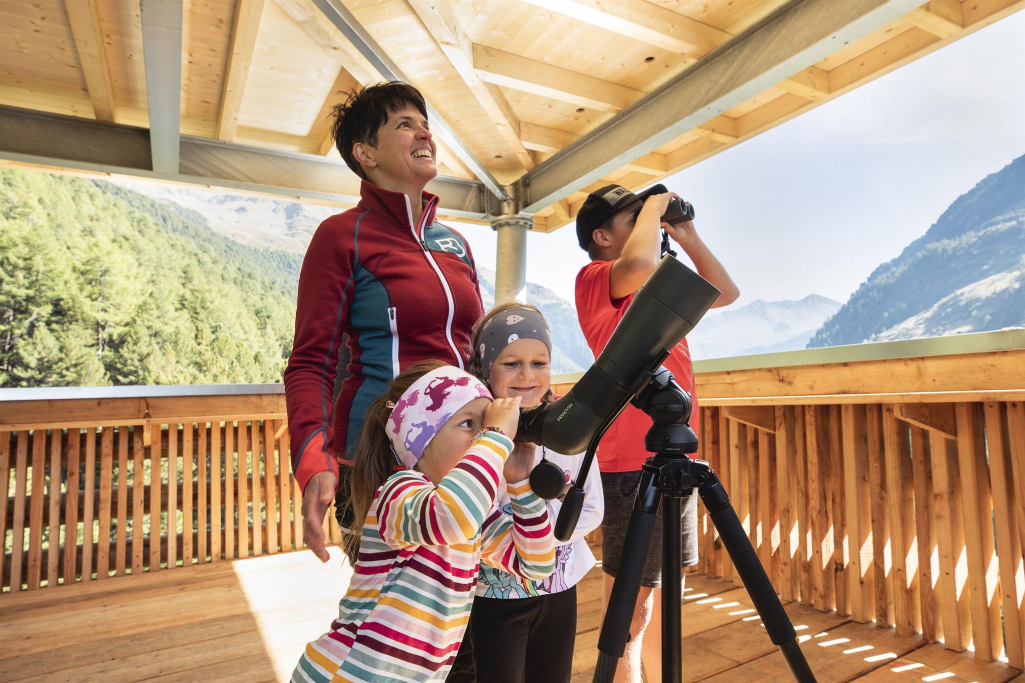The Oberhaus wildlife observation tower in Defereggental also offers a special nature experience for young and old. High above the treetops, the 22-metre-high tower invites you to let your gaze wander over the National Park Hohe Tauern and the largest closed stone pine forest in the Eastern Alps. Looking over the treetops, with a little luck and patience you might spot an eagle, bearded vulture, deer, chamois or marmot.