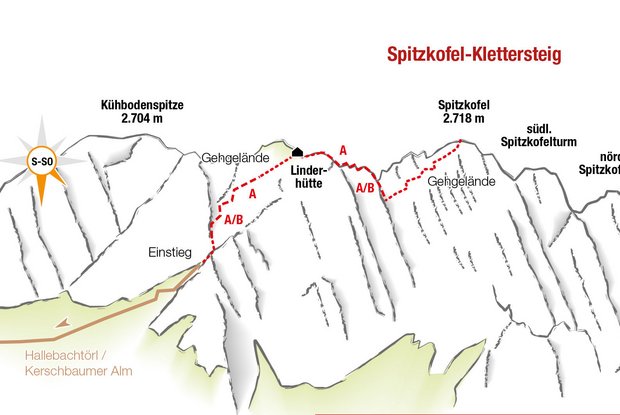 From Klammbrückl car park (natural landmark) up the well signposted path to Hallebach (ford). Just before the river, proceed right, along the well-used steep path. The route is challenging, heading through larch and mountain pine forest up to the Böseggtürme and the steep path which proceeds from Hallebachtörl to the Spitzkofel. Continue on the steep path in a northerly direction up to around 2500m. The via ferrata route begins at Linderhütte. Via the descent, secured with steel cable, about 50 m down into the Spitzkofelscharte and after this about 100 m - also steel cable secured - up to the summit at 2717m.