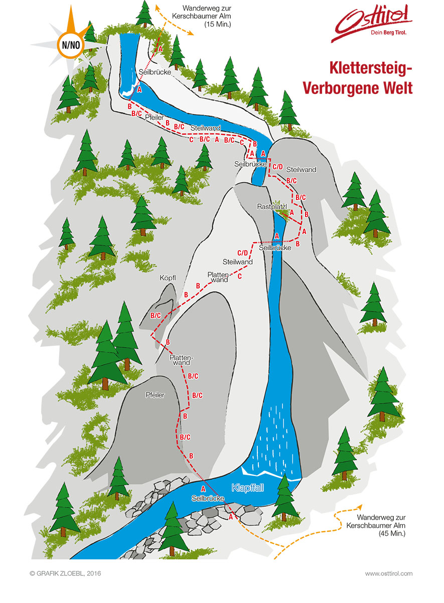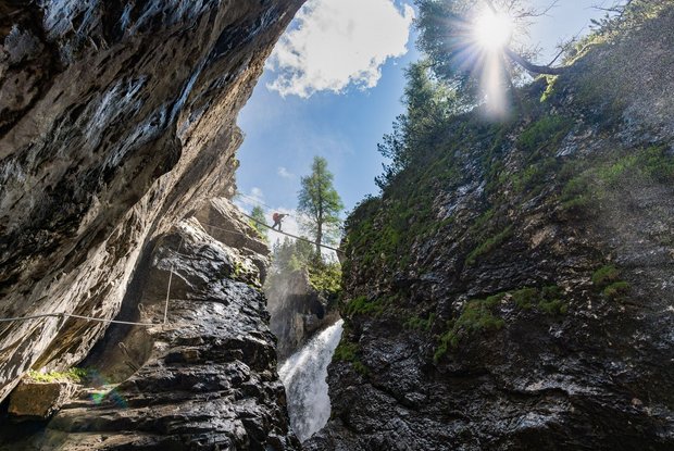 The 'Verborgene Welt' via ferrata route heads spectacularly past at waterfall. The Klapffall has formed over centuries, cutting deeply into the rocks and is therefore an eroded gorge system. The entrance is close to the standard hiking trail from the gorge bridge to Kerschbaumeralm bothy.