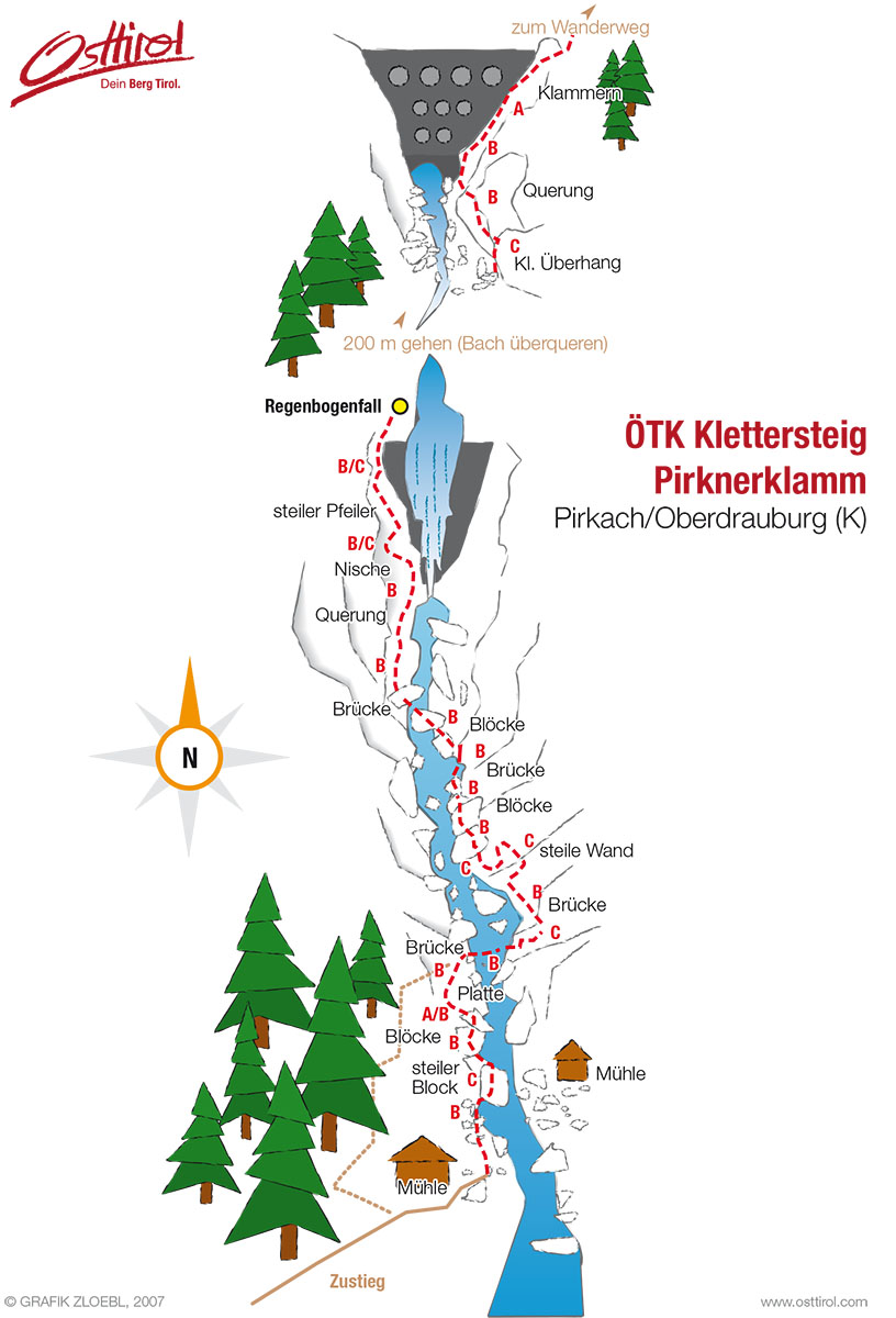 Ein eindrucksvoller, nicht allzu schwieriger Schlucht-Klettersteig, der entlang des Pirkner Baches am ostseitigen Bergfuß des Hochstadels - in der Pirkachklamm - angelegt wurde. Höhepunkt des Steiges ist die Steilpassage an der ersten Wehranlage – neben dem rauschenden Regenbogenfall – hier erzeugt die Gischt bei Sonnenschein einen Regenbogen! Zahlreiche Postmanswalk-Brücken (gespanntes Halteseil und lockeres Gehseil) bieten einen zusätzlichen Nervenkitzel. Aufgrund des kurzen Zu- und Abstieges ideal als Zwischendurchbeschäftigung für einen Vor- oder Nachmittag.