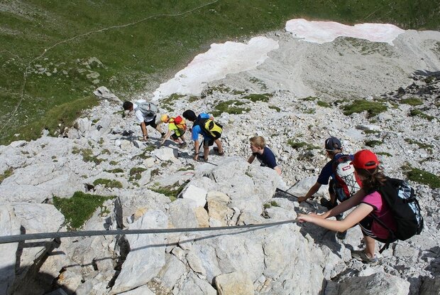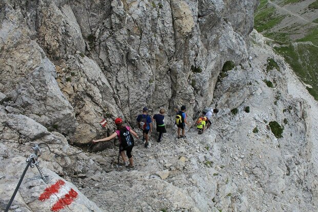 Schwierigkeiten: A/B. Beide Anstiege sind an den ausgesetzten Stellen mit durchlaufenden Seilen versichert und bei entsprechender Umsicht unschwierig.