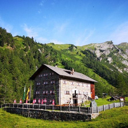 Am besten startet man diese Etappe beim Parkplatz im Weiler Glanz, dann spart man sich zwei Stunden Anmarsch. Von Matrei i.O. kann man mit dem PKW (Taxidienst auf Anfrage) in 20 Minuten dorthin gelangen. All jene, die auch diesen ersten Streckenabschnitt zu Fuß bewältigen wollen, gelangen über den wenig befahrenen Fahrweg von Matrei über Hinterburg zum Parkplatz. Vom Parkplatz in Glanz kommt man in 1 ½ bis 2 Stunden zur Äußeren Steiner Alm und in weiteren 2 bis 2 ½ Stunden zur Sudetendeutschen Hütte. Der Steig führt großteils durch einen Wald mit uralten Lärchen, vorbei an der Köfler-Almhütte (Privatalm). Im Bereich der Ranzeralm quert man zweimal den Fahrweg. Etwas oberhalb der Lackner-Almhütte beginnt ein Karrenweg, der an einer Quelle vorbeiführt, ehe er von Osten nach Westen die Edelweißwiese durchzieht. Wer nicht durch den Wald wandern möchte, kann auch vom Parkplatz Glanz entlang der Forststraße bis zum Beginn der Edelweißwiese gehen. Nach einer Felskante fällt der durch ein Geländer geschützte Steig in den lichten Lärchenwald leicht ab. Über den Steinerbach gelangt man zu den Almhütten der Äußeren Steiner Alm (1.914 Meter), von der Äußeren Steiner Alm geht es in der flachen Trogtalsohle nordöstlich weiter in Richtung Talschluss. Kleine Lärchenhaine und gewaltige Grünschieferblöcke prägen diesen romantischen Wegabschnitt. Am Ende des Talschlusses führt eine Materialseilbahn zur Sudetendeutschen Hütte, hier befand sich früher eine Förderstätte des Eisenerz-Bergbaus, deshalb wird der Talwinkel als „Schmelzhütte“ bezeichnet. Der Steig zur Sudetendeutschen Hütte führt zuerst nah am Steinerbach hinauf, dann windet er sich in Kehren über die Wiesenhänge empor, wobei man den Nussingkogel zur linken und die Bretterwandspitze zur rechten Seite hat. Schließlich wird das Gelände mit seinen von den Gletschern geformten Kuppen etwas flacher und schon befindet man sich im Nahbereich der geräumigen Sudetendeutschen Hütte (2.650 Meter) inmitten der Granatspitzgruppe.