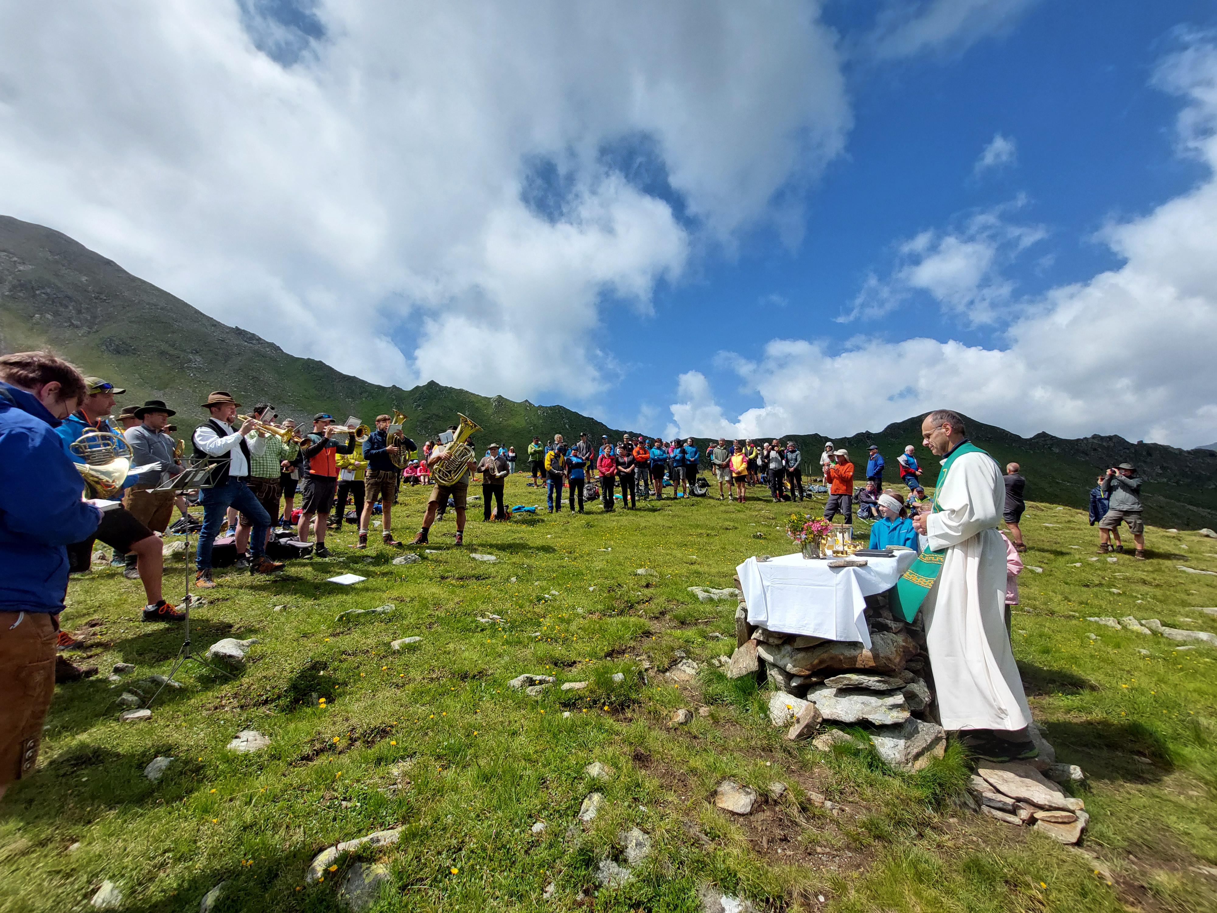 Um 12.00 Uhr feiern wir die Bergandacht oberhalb des Zupalsees, musikalisch umrahmt von den teilnehmenden Weisenbläsern und Sängern.