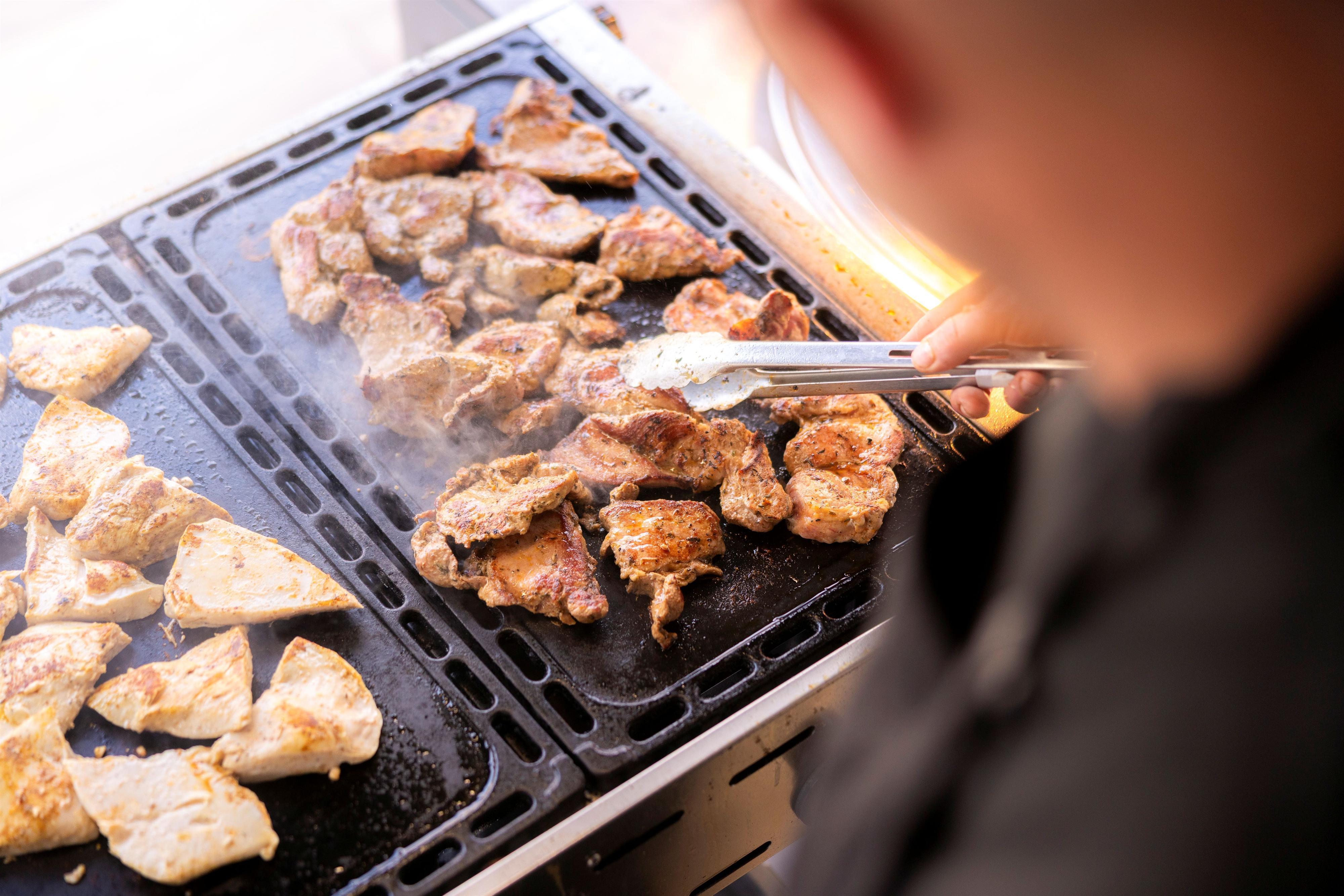Geboten wird ein umfangreiches All-you-can-eat-Grillbuffet mit Vorspeisen-, Brot- und Salatbuffet sowie Live-Grillen mit frischen Fisch- und Fleischgerichten, Würstl und Seafood. Dazu Grillgemüse, verschiedene Beilagen und Saucen, eine Burger-Ecke sowie eine erweiterte Auswahl an vegetarischen und veganen Spezialitäten – alles, was das Grillherz begehrt.