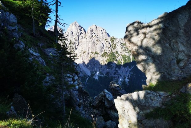 Al parcheggio della Dolomitenhütte, il sentiero sale subito a sinistra attraverso un prato. Dopo la breve sezione nella foresta, inizia la prima sezione assicurata con la corda su terreno roccioso. È facile da fare anche senza un set da ferrata. Dopo la cresta si arriva al Weißsteinalm (non gestito) e si seguono le indicazioni attraverso il prato alpino moderatamente ripido. Dopo circa un'ora di cammino, inizia la parte impegnativa dell'escursione. Dopo l'Auerlingköpfl, il sentiero conduce, attraverso passaggi di roccia assicurati da corde, a un canalone di ghiaia sotto il Laserzwand. Il sentiero in ripida salita conduce in diverse serpentine all'Hohe Törl (2.098 m). Questa zona è molto accidentata e richiede un passo sicuro (pericolo di caduta di rocce da parte degli escursionisti davanti). Dopo il Törl, il sentiero scende leggermente e passa per molti ingressi di arrampicata e vie ferrate. Dopo il Laserzwand, il sentiero si ricongiunge alla strada larga. Dopo circa 2,5 ore si arriva finalmente alla Karlsbader Hütte.