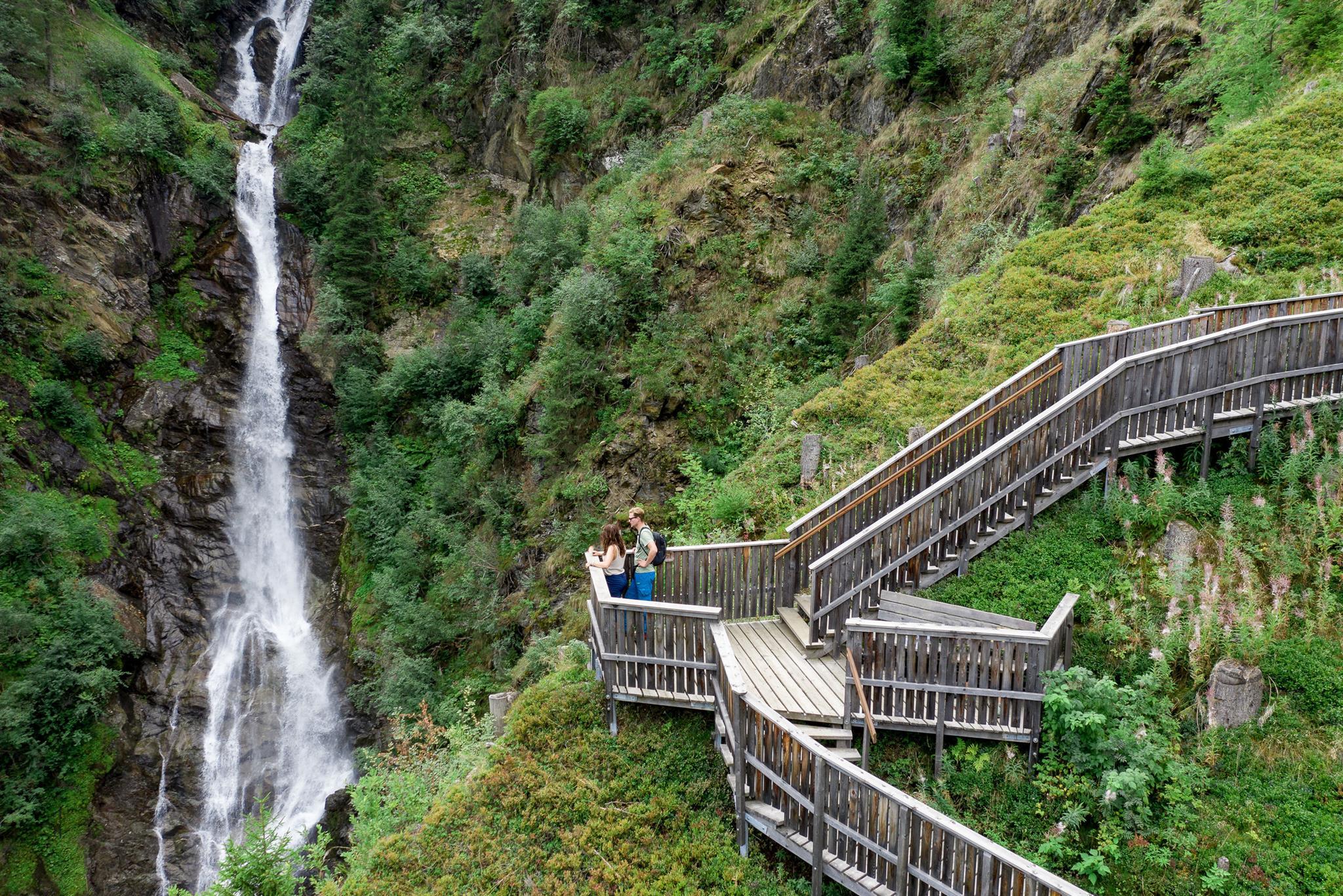 Camminando lungo il sentiero nell' acqua St. Jakob i. D. verso lo Stadtner Mühle, è possibile raggiungere da lì in breve tempo un'imponente piattaforma panoramica "galleggiante" sopra la cascata. La potenza dell'acqua e gli spruzzi del fresco ruscello di montagna impressionano per un lungo tempo gli spettatori. In alternativa, è possibile raggiungere in auto Maria Hilf e parcheggiare vicino a questa chiesa meta di pellegrinaggi. Da lì si raggiunge in circa 20 minuti la piattaforma panoramica e lo snack bar sull'Alpe Stalle.