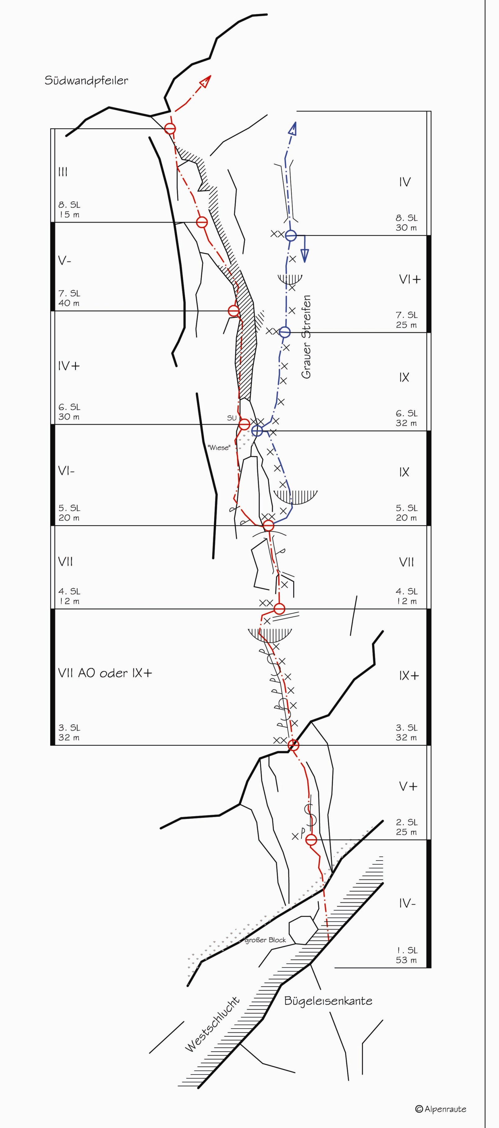 Über die Westschlucht bis ca. 10m hinter den großen Block, Fixseil, dann links hinauf zum markanten Riss.