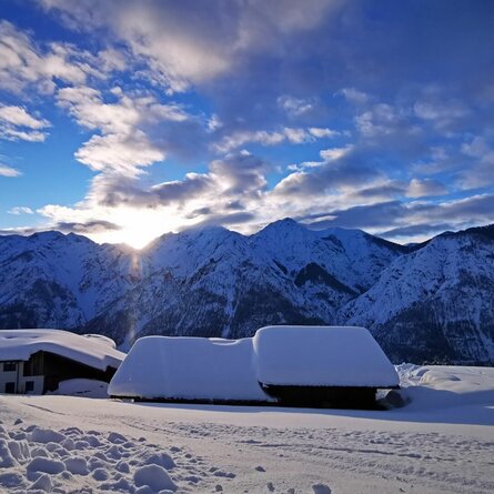 Die Schönberglspitze befindet sich in den östlichen Ausläufern der Deferegger Berge, in dem vom Lienzer Hausberg Hochstein nach Nordwesten ziehenden Kammverlauf. Sie ist von der auf einer Hangterrasse gelegenen, lieblichen Ortschaft Schlaiten über urige Almen erreichbar und vermittelt eine wunderbare Aussicht auf das Iseltal und den Großraum Lienz. Genussspechte werden bis zu den sonnverbrannten Hütten der Krass- und Petoggalm aufsteigen, die allein schon ein lohnendes Tourenziel darstellen. Ausgangspunkt ist das Mesnerdörfl Schlaiten, ca 10 km nordwestlich von Lienz. Wir nützen die Straße durch den Ort bergwärts, ehe uns Schilder vor der Brücke am Schlaitnerbach zweimal nach links steil aufwärts Richtung Glanz leiten. Über die schmale Bergstraße talauswärts kommen wir nach ca. 1 km zum Beginn der Tour bei einer Weggabelung (995 m, wenige Parkmöglichkeiten). Die Straße führt hier leicht fallend nach Glanz – Oberlienz, während wir uns an die gelbe Tafel zur Krass Alm halten. Zuerst heißt es noch entlang der Straße kurz Ski tragen, bevor wir in der ersten Rechtskehre, unterhalb eines Hauses, in den undurchdringlichen Bannwald verschwinden und so die erste Schleife abkürzen. Es kann auch vom Haus über den weiterführenden, im Winter zu einer Rodelbahn umfunktionierten Forstweg zur Krass Alm angestiegen werden (Wegtafeln), was bei wenig Schnee empfehlenswert ist. Nach der ersten Abkürzung benützen wir den Güterweg weiter bis zu einem netten Waldkreuz in einer Rechtskehre. Kurz drauf können wir wieder durch den Bannwald mehrmals abkürzen oder gemütlicher weiter über den Forstweg aufsteigen (Wegtafeln), was Ortsunkundigen zu empfehlen ist. Wer sich schließlich durch den 500 Höhenmeter messenden Waldgürtel gemüht hat, betritt bei einer Schupfe (1.450 m) die herrlichen Lichtungen und hält sich über freien Flächen bergwärts. Forstweggeher werden über einen Stichweg etwas höher ins Almengelände stoßen. Ziel ist das auffallende, große Wirtschaftsgebäude der Petoggalm (1.815 m). Der Weiterweg führt nun durch reizvolle Mulden nach Südwesten und strebt oberhalb der Waldgrenze in einen kleinen Kessel. Dieser wird in einer markanten Linksquerung (Osten) unter steilen Hängen (NO, 30°) verlassen und der begleitenden Rücken am möglichst flachsten Abschnitt betreten. Achtung, Lawinengefahr! Bei unsicheren Verhältnissen kann auch im Bereich der Waldgrenze zum Rücken traversiert werden. Stets auf diesem bleibend erreichen wir nach etlichen Spitzkehren bei ca. 2.540 m den Gipfelgrat zwischen Schönberglspitze und Lavant-eck, wo wir über den blockigen Nordwestgrat meist ohne Ski zum höchsten Punkt aufsteigen. Abfahrt entlang der Aufstiegsspur.