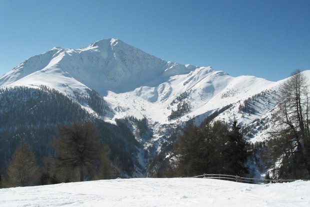 Sonniger Winterwanderweg am Ende des Kalsertales unterhalb der Bretterwand.