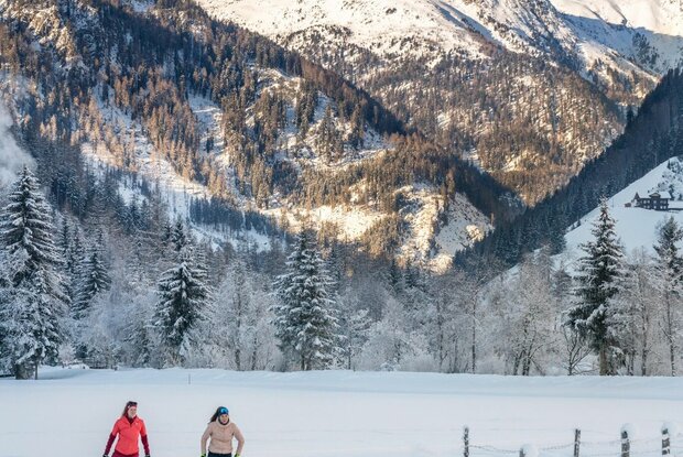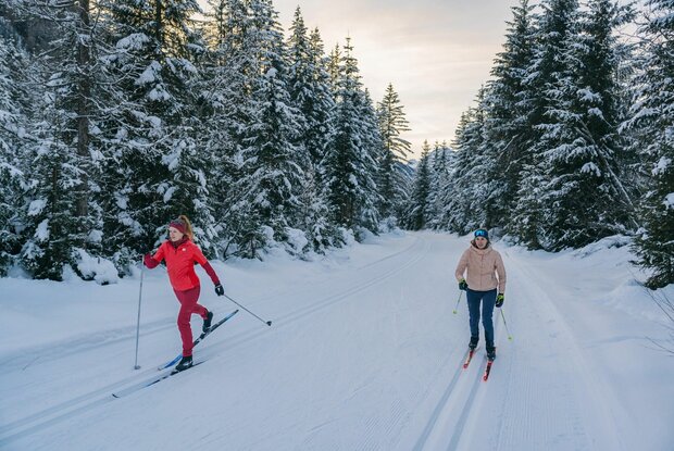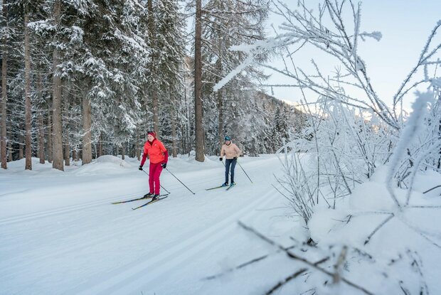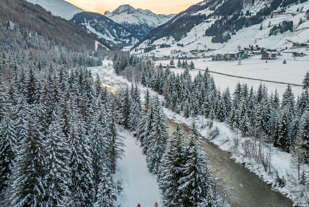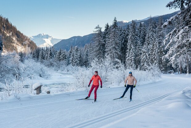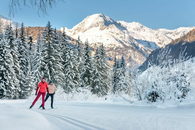 Die Loipe für Genießer schlechthin, fast ausschließlich flach in wunderschöner winterlicher Idylle durch Wald, Wiesen und am Wasser. Nach der Mittelschule laufen wir vor bis zur Brücke, die Loipe startet nun links talauswärts, nach ca. 500 Metern biegt man rechts ab und taucht in einen Wald ein, vorbei an Villgrater Natur und in diesem Abschnitt paralell mit der Loipenspur St.Leonhard geht es wildromantisch bis zur Lackbrücke und an der Schwarzach wieder zurück.