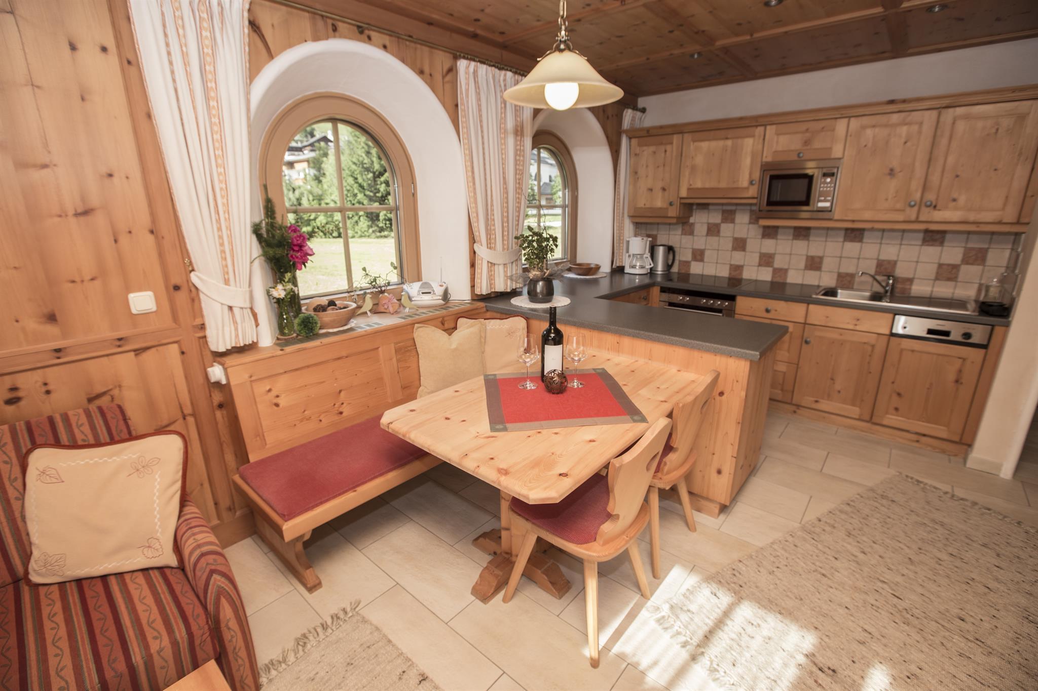 Unsere Gäste schätzen besonders die gemütliche Atmosphäre in der Tiroler Zirbenstube mit Kachelofen und die direkte Verbindung zur Sonnenterrasse mit eigenem Garten.