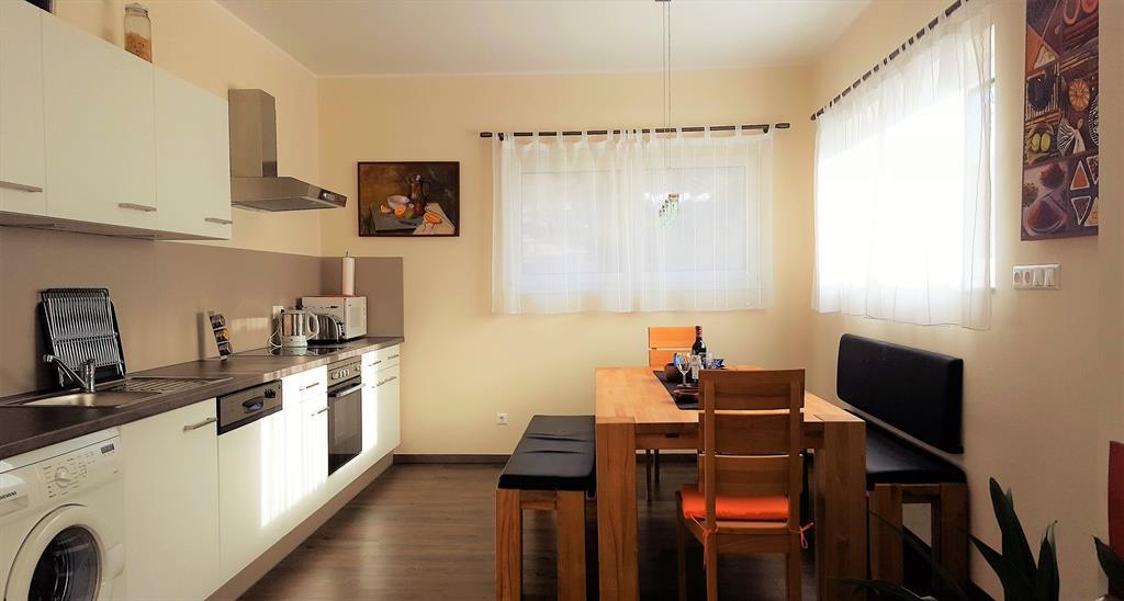 Küche mit geräumiger Essecke (Herd/Ofen, Mikrowelle, Kühlschrank, Spülmaschine, Waschmaschine)