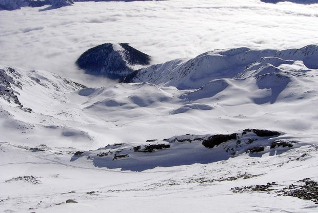 Der Gumriaul verbirgt sich in der Sonnseite des Pustertals, weit oberhalb der wunderschön gelegenen Ortschaft Anras (1.262 m). Ein markanter Grat mit senkrechtem Trennschartl verbindet ihn mit seinem nördlichen Nachbarn, dem Gölbner. Das südseitige Skigelände des Gumriaul ist weitläufig und einladend, auch wenn zu Be-ginn fünf Kilometer Forststraße bewältigt werden müssen. Dies und die manchmal schlechte Schneequalität könnten vielleicht Gründe sein, warum der Gumriaul im Winter ein recht einsames Dasein fristet. Ausgangspunkt ist der kleine Weiler Goll (1.245 m). Von der Umfahrung Abfaltersbach biegen wir auf die Pustertaler Höhenstraße und folgen dieser durch das aussichtsreiche Dorf Asch, bis nach ca. 2,5 km ein Straßenschild linker Hand zum Weiler weist. Bei den letzten Bauernhäusern angelangt, biegt die Straße nochmals nach links (Westen) und führt oberhalb prächtiger Felder zum Gehöft Kollreid (gelbe Tafeln beachten). Kurz vor diesem, dort wo die Straße leicht abwärts geht, zweigt nun rechts ein Forstweg zur Ascher Alm ab (Schranken, wenige Parkmöglichkeiten). Die spärlich markierte Forststraße (2a) bildet den Anstieg und wird bis zur Alm nicht mehr verlassen. Nach 1 ½ Stunden ist die Hütte erreicht und gelbe Wegtafeln leiten uns nach Osten zu einem kleinen Wiesensattel (1.942 m) unterhalb des Spielbichls. Hier endet der Güterweg und wir halten uns um den Bergrücken herum Richtung Norden in den Mühlbachgraben. Nach einer ansteigenden Querung wird das Gelände steiler und in Spitzkehren geht es links vom Mühlbachl durch schöne Muldensysteme bergwärts. Ab 2.400 m gibt es die Möglichkeit, nach Osten zum herrlichen Anraser See zu queren oder das kleine Tälchen weiter zu nützen, um zum trapezförmigen Gipfelaufbau zu gelangen. Der abschließende steile und oft eingeblasene Südhang (bis 35°) darf nur bei sicheren Verhältnissen begangen werden, sonst empfiehlt sich die Umgehung über den linken (Westen), unschwierigen Gratrücken, wo wir entlang des Sommerwegs zum höchsten Punkt mit großem Holzkreuz steigen (4-5 Stunden vom Tal). Skidepot je nach Verhältnissen, Abfahrt entlang der Aufstiegsspur.